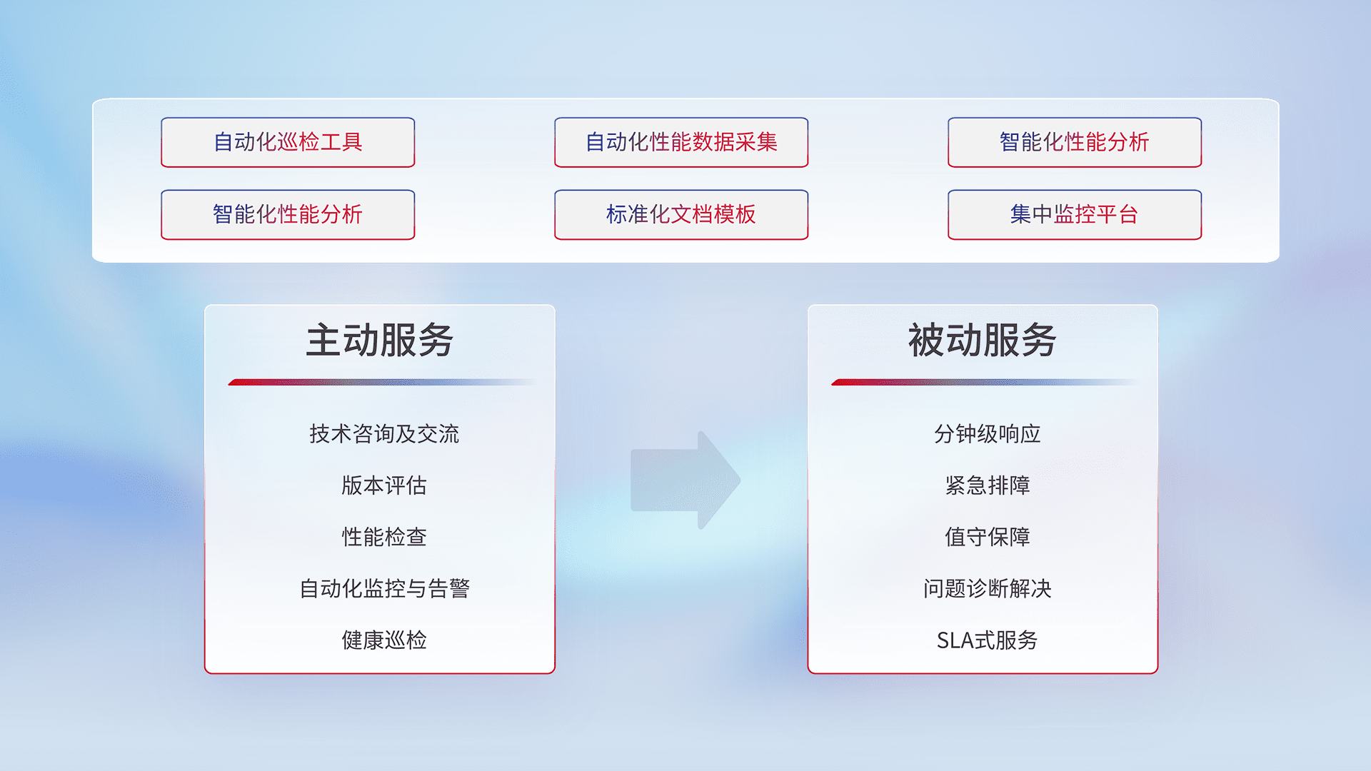 智能化工具和标准化文档,,保障服务质量,,,,提供主动服务(包含技术咨询、、、、版本评估、、、性能检查、、、、自动化监控与告警、、健康巡检)和被动服务包含(分钟级响应、、、、紧急排障、、、、值守保障、、、、问题诊断解决、、、SLA服务)。。